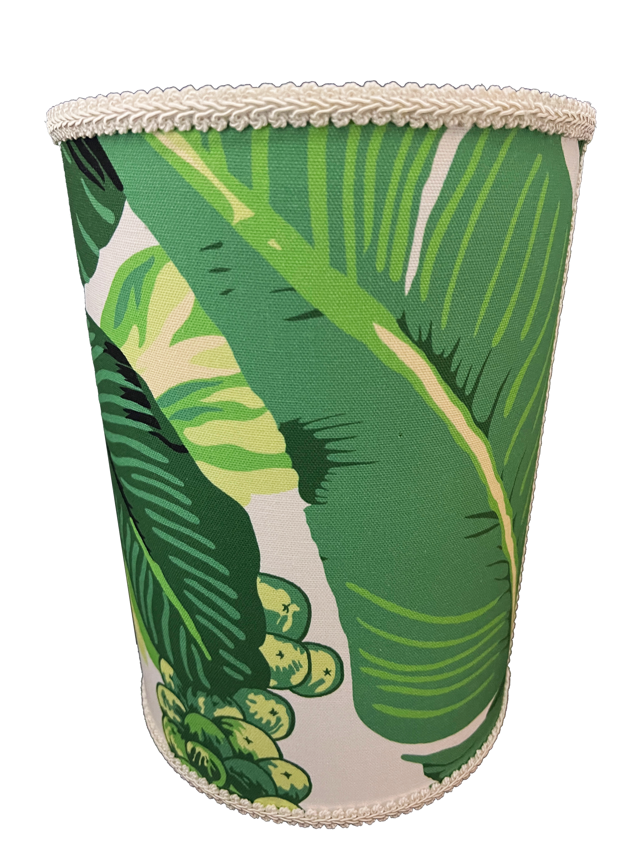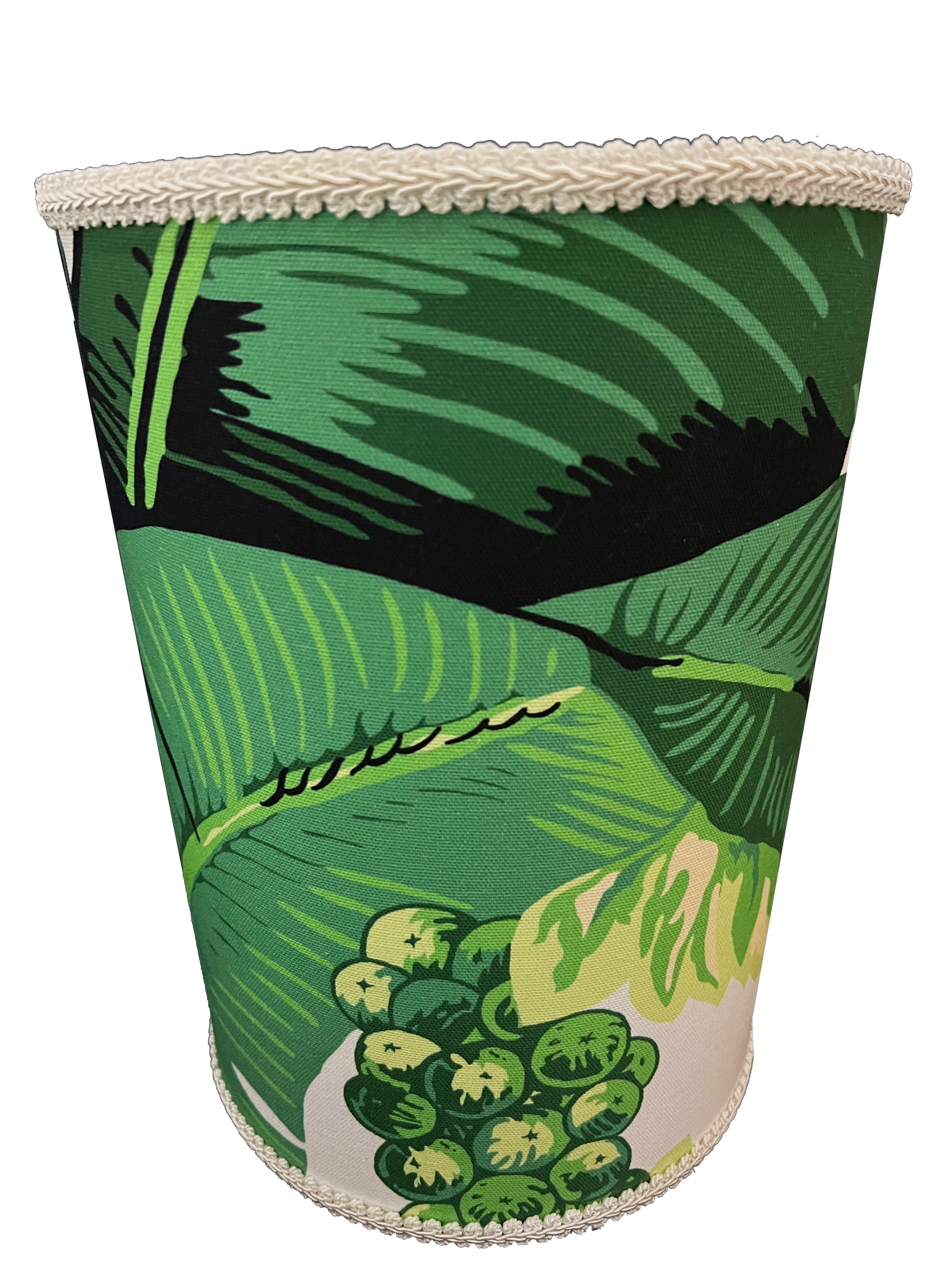 Waste basket covered in our Dorothy Draper Brazilliance fabric and trimmed in a coordinating woven cord.