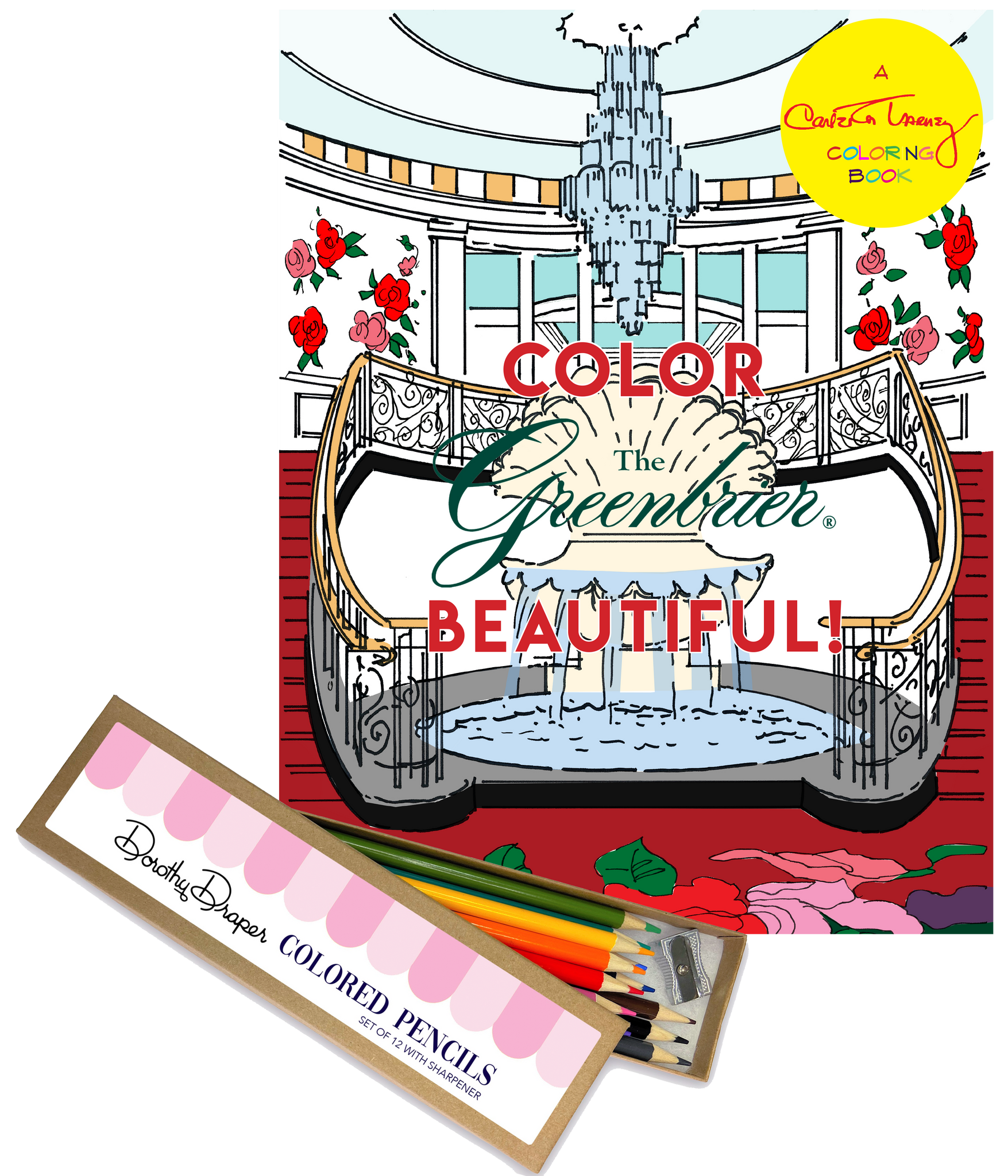 Create your own colors for The Greenbrier! Original Carleton Varney Coloring Book featuring 26 full coloring pages. Includes Dorothy Draper Colored Pencil Set - featuring 12 colored pencils and a sharpener