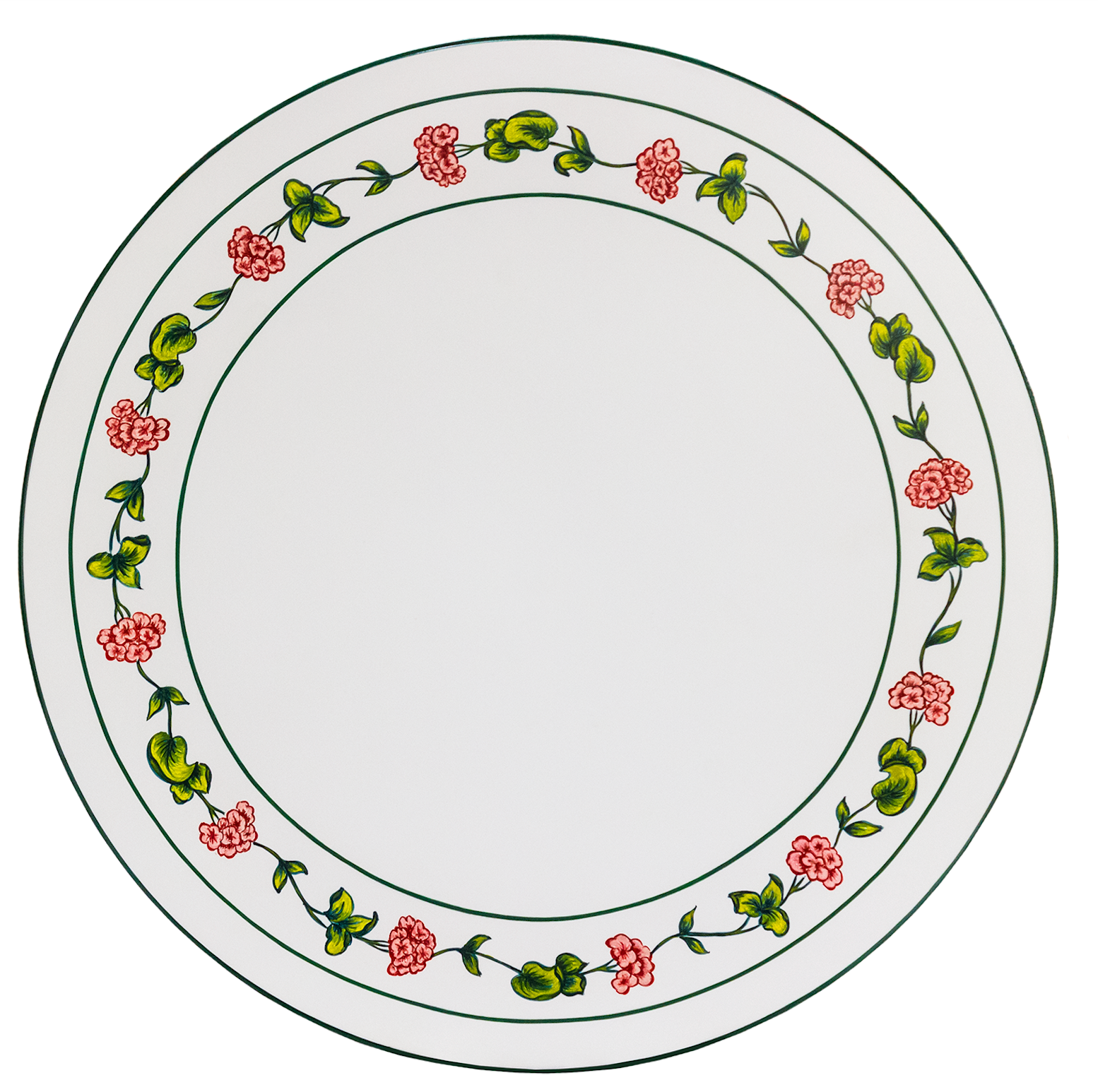 This jewel of a table is finished in white lacquer standard with hand-painted Grand Hotel Green accents. Hand painted geranium border is optional for an extra charge.