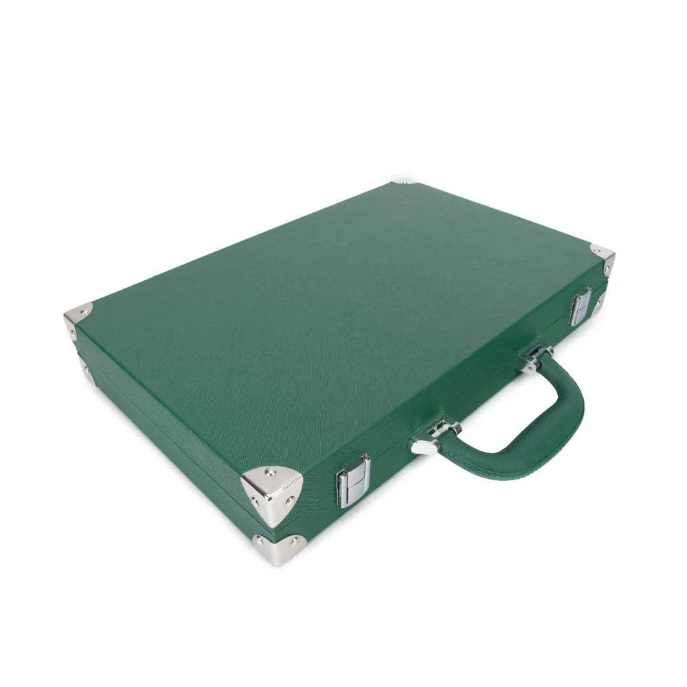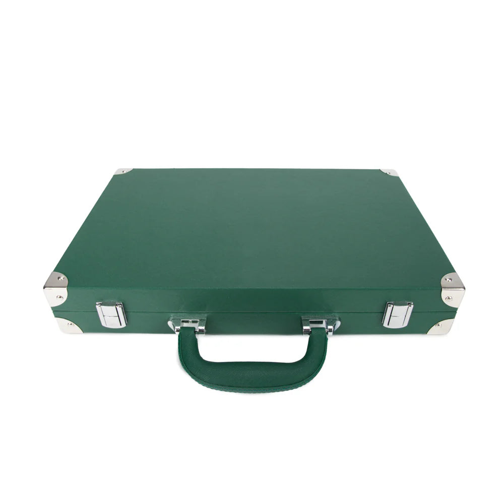 Ready for gaming on the go with this luxe vegan leather travel backgammon set. Features felt interior with painted triangles, dice cup, black and ivory chips and dice.